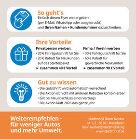 Vielleicht sucht jemand im Freundes- oder Bekanntenkreis gerade nach einer günstigen neuen Mobilitätslösung. Auch Unternehmen, Vereine oder andere Organisationen können geworben werden – zum Beispiel der eigene Arbeitgeber.